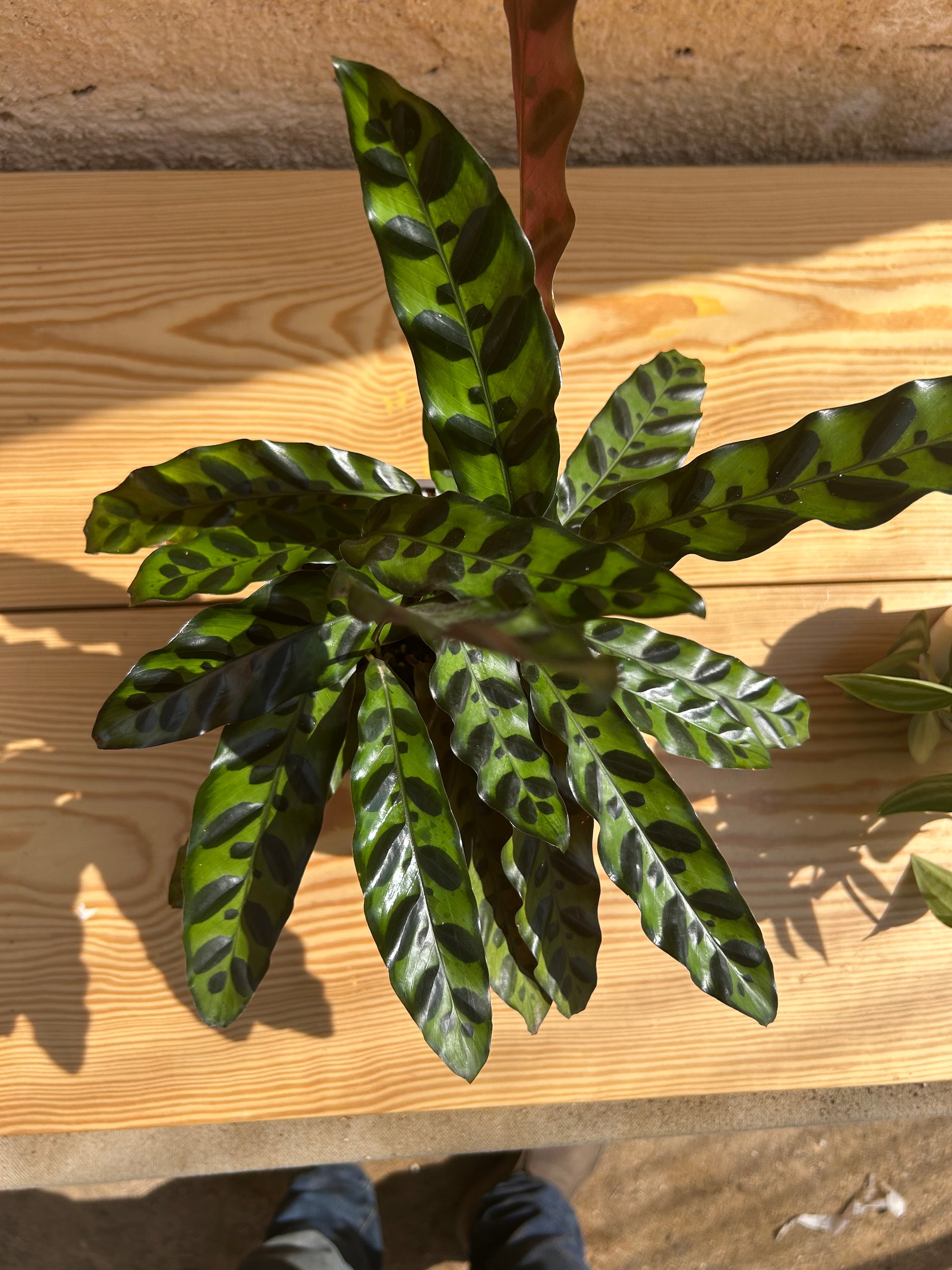 Bring a jungle vibe indoors with the elegant Rattlesnake Plant! Its wavy green leaves marked with dark patterns and rich purple undersides move gently with the light — a living piece of art that thrives in cozy indoor spaces.