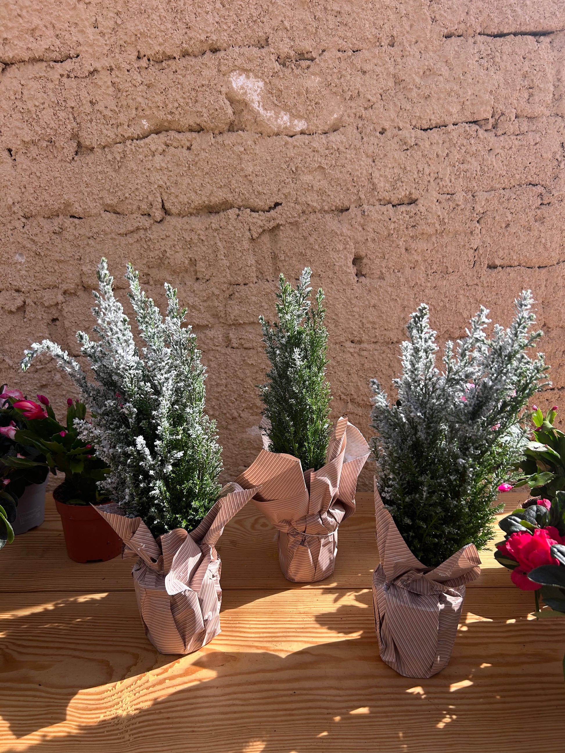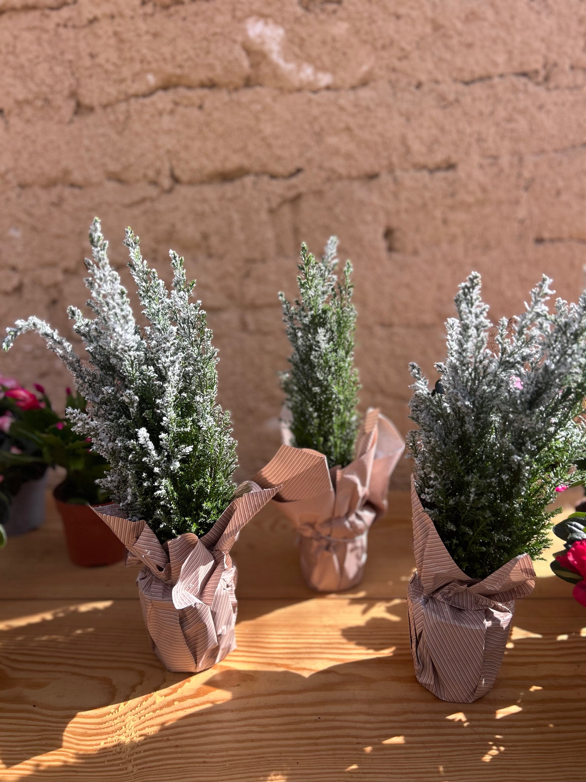 The snowy coating is decorative — avoid washing or heavy misting.